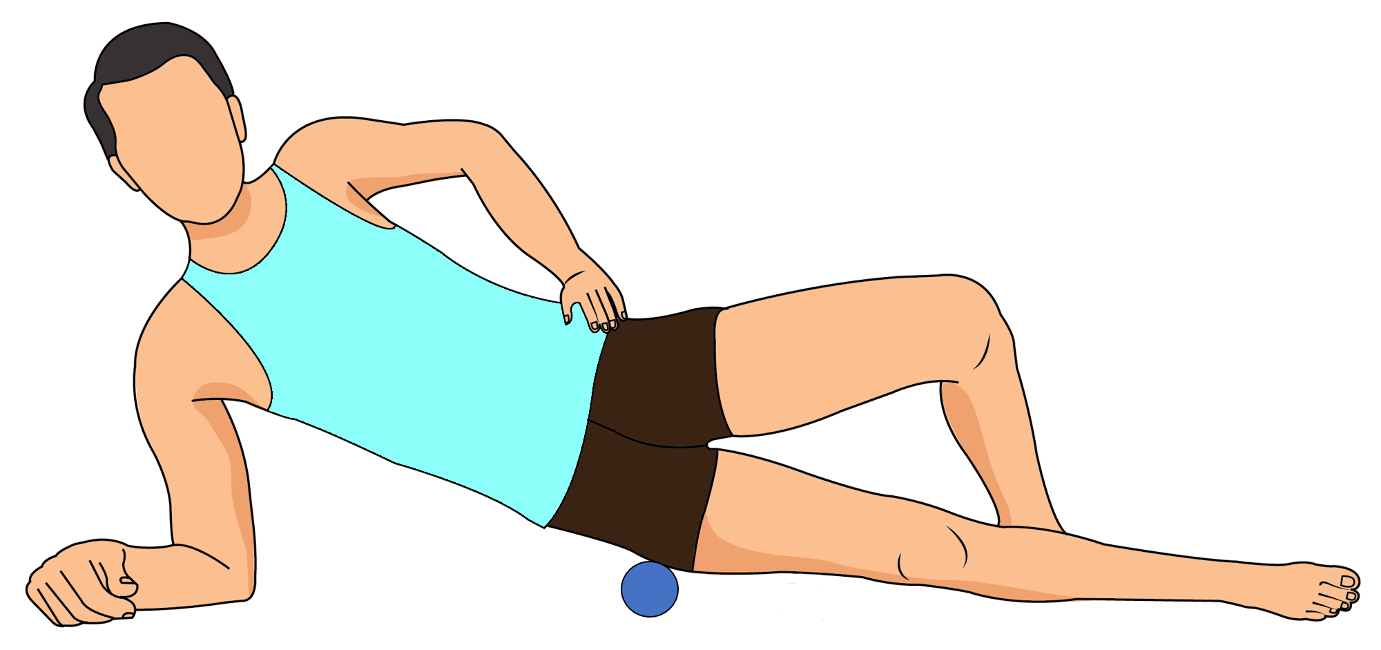 Lie on your side that’s experiencing tightness, and then place your forearm on the ground while extending your leg. Bring your other leg over in front of you. Place the massage ball under your hip then put your hand on the ground in front of you. Move your hips around to release the tension in the tight areas.